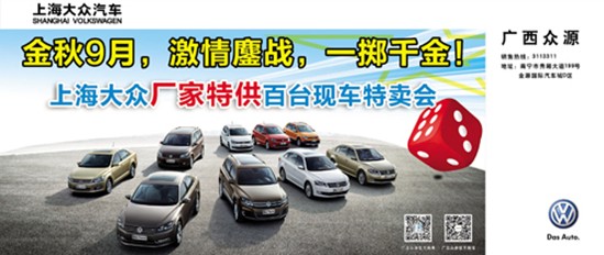 金秋九月,激情鏖戰(zhàn),一擲千金!9月7日至9月8日,上海大眾廣西眾源4S店現(xiàn)車特賣,廠家直供100臺(tái)特價(jià)現(xiàn)車,優(yōu)惠超越歷史幅度!凡活動(dòng)期間到廣西眾源4S店購(gòu)車的朋友,均可享受前所未有的活動(dòng)優(yōu)惠價(jià)格!