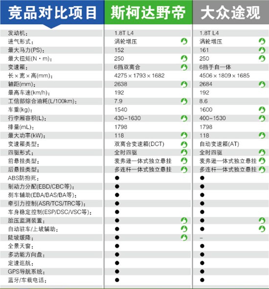 以同一發(fā)動機(jī)排量1.8T為例,盡管斯柯達(dá)野帝最高馬力為152匹,小于途觀(161匹)9匹馬力,但同一排量一樣可以輸出250N.m的扭矩;而斯柯達(dá)野帝搭載的是6速雙離合的變速箱要明顯優(yōu)越于搭載6檔手自一體的途觀,無論在操控或超車過程中要?jiǎng)俪鲆换I。此外,斯柯達(dá)1.8T雙離合的野帝官方公布的油耗為7.9升/百公里,而途觀側(cè)是8.6升。