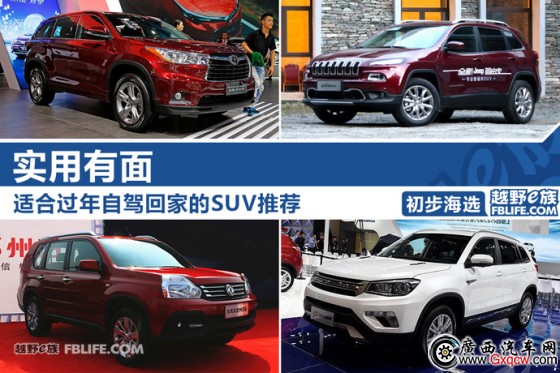 眼看著羊年即將結(jié)束,春節(jié)即將來臨,不少身處異鄉(xiāng)工作奔波的各位也到了該回家的時(shí)候了。然而鐵道部購(gòu)票網(wǎng)站買票的艱難,還有那奇葩的驗(yàn)證碼,讓不少人望而卻步。這時(shí)候,自駕車回家就是一種非常理想的方法。在車?yán)锓浅7潘,不用?dān)心火車飛機(jī)上會(huì)有人(無意或故意)拿錯(cuò)行李,而這就要求必須要有一個(gè)比較充裕的儲(chǔ)物空間。并且長(zhǎng)途旅行勢(shì)必勞累,一些駕駛輔助的配置就非常必要了,比如定速巡航、座椅按摩等,均可以緩解駕駛的疲勞。在外工作了一年,回到家鄉(xiāng)必須要給人眼前一亮的感覺,所以自駕車的外形也必須吸引人,所以外觀也是需要考慮的一方面。現(xiàn)在就來給各位推薦幾款開車回家實(shí)用有面的SUV車型。