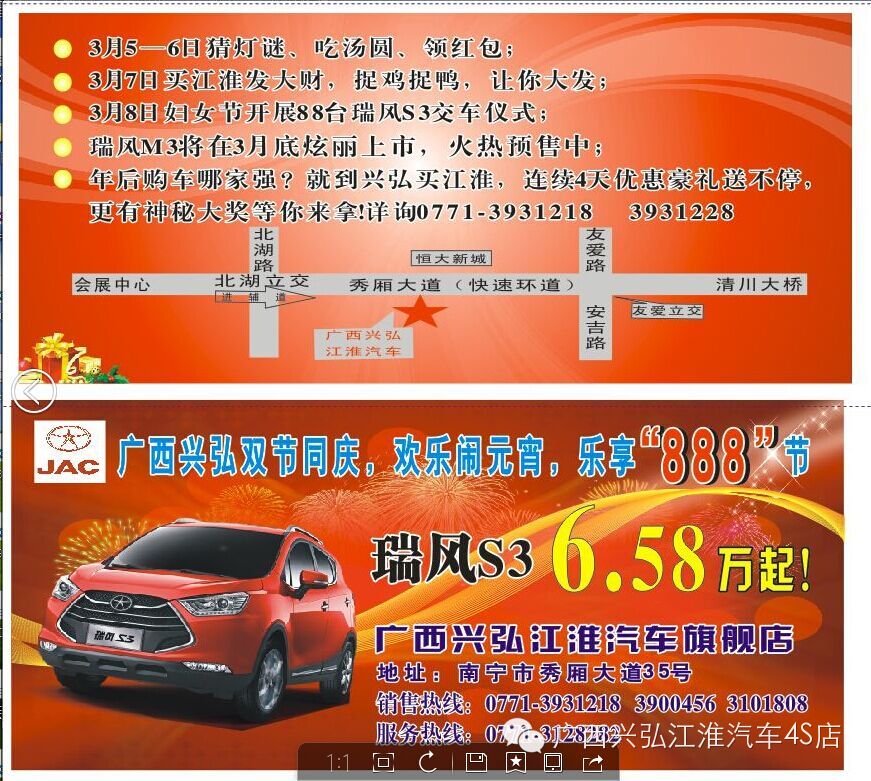 廣西興弘江淮在正月十五-正月十六(3月5日-6日)再為大家精心準備了猜燈謎、吃湯圓、領紅包活動,在正月十七(3月7日)買江淮發(fā)大財,抓雞抓鴨,讓你大發(fā)活動,在正月十八(3月8日)婦女節(jié)開展88臺瑞風S3交車儀式,連續(xù)4天優(yōu)惠豪華大禮送不停,廣西興弘江淮汽車盛情邀請您的參與。