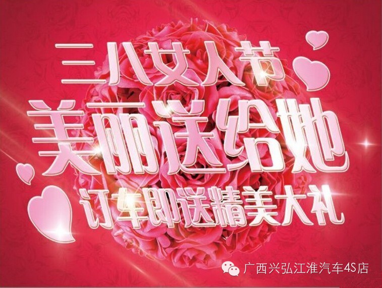 二月的春節(jié)和浪漫的元宵情人雙節(jié)剛剛過去,代表春意濃濃的三月迎來了一年一度的“三 八”國際婦女節(jié)。在“三八”婦女節(jié)來臨之際,廣西興弘江淮4S店祝愿廣大女性朋友節(jié)日快樂!三月女人天,女人的專屬特惠之際,各種的“呵護(hù)”如曇花般綻放。廣西興弘江淮4S店今天3月8日舉辦“88臺 瑞風(fēng)S3交車儀式”主題促銷活動,活動期間我們將為女性朋友們準(zhǔn)備多款特別車型,凡3月8日到店看車的朋友均有紅包發(fā)放、精美禮品贈送,女車主們一定不要錯過給您呵護(hù)的機(jī)會喔!