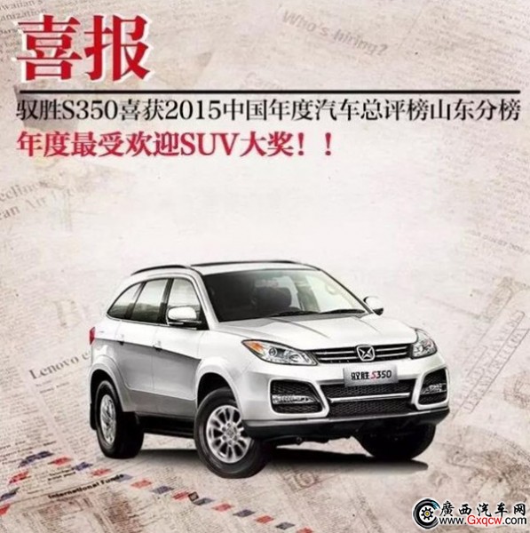 2015年中國(guó)汽車總評(píng)榜山東分榜近日揭曉,馭勝S350憑借過(guò)硬的實(shí)力和良好的消費(fèi)者口碑摘得“2015年度最受歡迎SUV”大獎(jiǎng)。