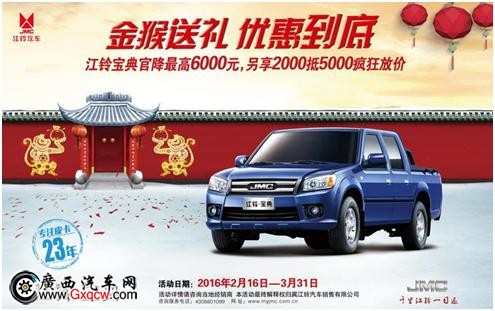 近日,小編走訪(fǎng)廣西江鈴安吉4S店了解到,即日起至3月31日到店購(gòu)江鈴寶典皮卡即可享受預(yù)交2000元訂車(chē)款抵5000元購(gòu)車(chē)款,購(gòu)車(chē)特惠季,江鈴寶典與您同行,欲購(gòu)車(chē)的廣大朋友速速到店搶購(gòu)吧!咨詢(xún)熱線(xiàn):0771-3119811.