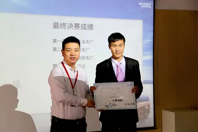在經(jīng)過將近兩個小時的激烈比賽之后,最終江鈴改裝車廠憑借清晰的改裝思路,獨到的改裝創(chuàng)意,從江鈴汽車銷售有限公司福特品牌事業(yè)部總經(jīng)理趙芳成手里接過獲獎**。