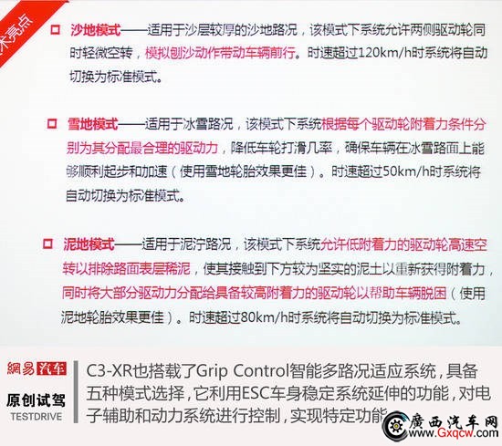 A:多模式系統(tǒng)很有幫助,足以應(yīng)付大多數(shù)路況;極限越野還是需要四驅(qū)系統(tǒng),C3-XR這樣的城市車型請繞行