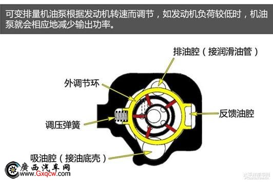 發(fā)動(dòng)機(jī)在不同的工況下需要的機(jī)油量也是不一樣的,1.6THP引擎上的機(jī)油泵由ECU 控制,通過外調(diào)節(jié)環(huán)的滑動(dòng)或者擺動(dòng)以改變轉(zhuǎn)子的偏心距,達(dá)到改變?nèi)~片泵的排量的目的。這樣既減少了油泵的損耗,也降低了發(fā)動(dòng)機(jī)的負(fù)荷。
