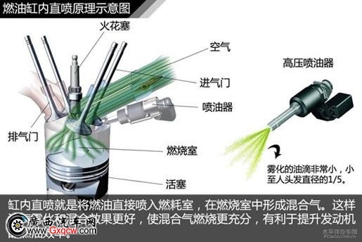 缸內(nèi)直噴技術(shù)就是直接將燃油噴射入缸內(nèi)與空氣混合。而ECU根據(jù)吸入的空氣量及車輛行駛狀態(tài)精確地控制燃油和噴射量和噴射時(shí)間,高壓燃油噴射系統(tǒng)使得油氣的霧化和混合效率更優(yōu)異,使混合氣體燃燒更加充分,能有效地提高發(fā)動(dòng)機(jī)的動(dòng)力性和經(jīng)濟(jì)性。