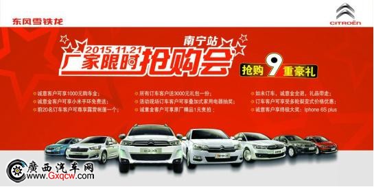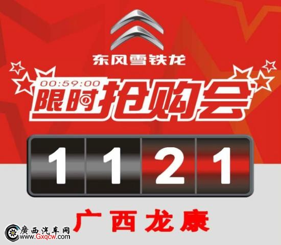 東風(fēng)雪鐵龍“限時(shí)搶購會(huì)”南寧站活動(dòng)廣西龍康專場(chǎng)將在2015年11月21日舉行,廠家主辦,年度大促,錯(cuò)過今次,再等一年! 采取臺(tái)階讓利模式,促銷讓利幅度不設(shè)上限。