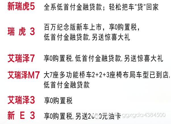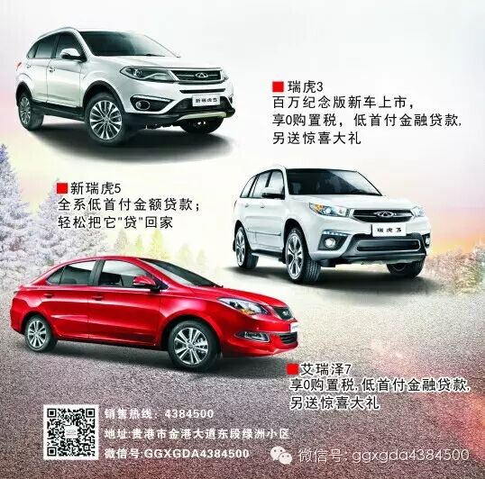熱烈祝賀貴港鑫廣達(dá)奇瑞2015年度圓滿完成廠家任務(wù),廠家特批20臺(tái)特價(jià)車(chē),全系0利潤(rùn)放價(jià),0購(gòu)置稅、全系低首付金融貸款,****的超低價(jià),只留給有準(zhǔn)備購(gòu)車(chē)的你!店內(nèi)現(xiàn)車(chē)資源緊張,想買(mǎi)車(chē)的朋友趕緊了,春節(jié)前購(gòu)車(chē),購(gòu)車(chē)的好時(shí)機(jī),“雙虎特價(jià)專(zhuān)場(chǎng)”等你搶購(gòu),先到先得搶完為止。