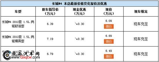 長(zhǎng)城M4是長(zhǎng)城M系宗族的一款硬派迷你SUV,M4的特性是不受捆綁,秀出自我,讓自在更進(jìn)一步,廣西長(zhǎng)道全城勁爆抄底價(jià)來(lái)襲,長(zhǎng)城M4現(xiàn)金優(yōu)惠3000元,現(xiàn)車充足,感興趣的朋友可以到店或來(lái)電咨詢購(gòu)買。銷售熱線:0771-2330301