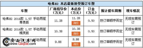 廣西長道汽車銷售服務(wù)有限公司店內(nèi)哈弗H2新車到店,訂金為0.5萬元 ,預(yù)計提車周期約為按訂單順序而定。廣西長道火熱接受預(yù)定中。國內(nèi)首款“百搭定制”車型—哈弗H2,7月11日正式上市,可提供都市版、精英型、尊貴型3款車型,價格分別為9.88萬元、10.38萬元、11.28萬元。感興趣的朋友可以到店咨詢購買,詳細(xì)情況見下表: