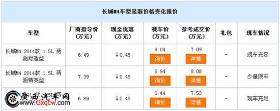 2014款長城M4優(yōu)惠幅度僅針對在我司辦理金融按揭服務(wù)客戶適用,其他購車方式優(yōu)惠情況請以店面銷售顧問報(bào)價為準(zhǔn)。