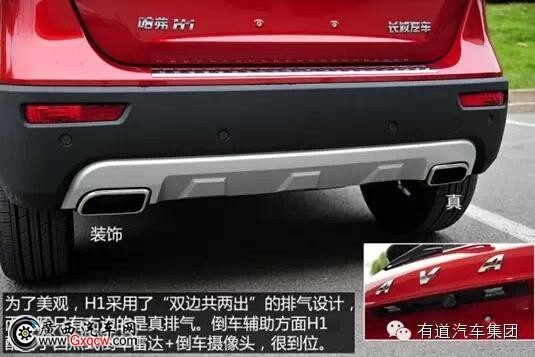 車尾設(shè)計(jì)并沒有像車頭那般霸氣側(cè)漏,但這才能讓H1整體顯得更和諧。為了車身更加美觀,H1采用了“雙邊共兩處”的排氣設(shè)計(jì),而實(shí)際只有右邊的是真排氣,倒車輔助方面H1配備了四點(diǎn)式倒車?yán)走_(dá)+倒車攝像頭,很是為大伙考慮呢。