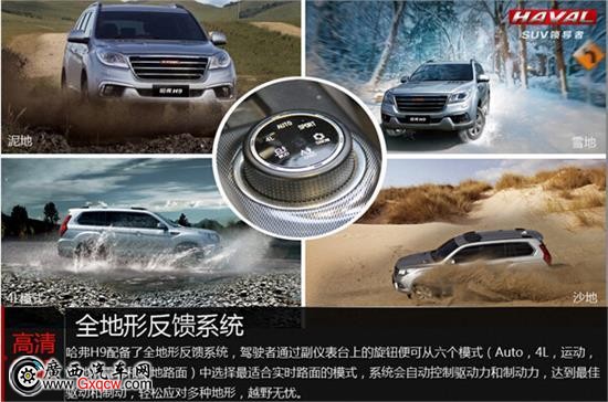 越野性方面,哈弗H9標(biāo)準(zhǔn)型標(biāo)配的是智能電控四驅(qū)(AUTO2H4H4L),而哈弗H9豪華型和超豪華型標(biāo)配的則是全地形反饋系統(tǒng)(AUTO、運(yùn)動、沙地、雪地、泥地、4L)以及電子式差速鎖,哈弗H9標(biāo)準(zhǔn)型和豪華型可以選裝電子式差速鎖。全地形反饋系統(tǒng)的操作也非常簡單,駕駛者通過副儀表臺上的多功能顯示器旋鈕,便可從六個模式中選擇最適合實時路面的模式,系統(tǒng)會自動控制驅(qū)動力和制動力,達(dá)到**驅(qū)動和制動。
