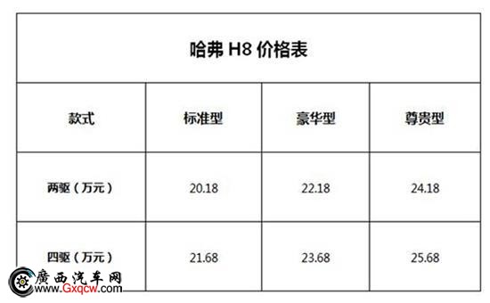 2015年4月20日,越級(jí)豪華SUV——哈弗H8在上海車展正式上市。重裝上陣的哈弗H8提供兩驅(qū)和四驅(qū)兩種款式,分為標(biāo)準(zhǔn)、豪華、尊貴三種車型,市場售價(jià)20.18萬元起。這是哈弗H8經(jīng)歷兩次上市波折后,以更加完美的全新姿態(tài)重新上市,兌現(xiàn)了長城人不達(dá)高端絕不上市的承諾。詳細(xì)價(jià)格請(qǐng)見下表。