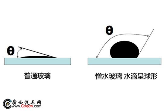 通過(guò)特殊的制造工藝在玻璃表面所形成的憎水膜具有較低的表面能,可以使玻璃表面液體分子間的相互作用力大于液體與玻璃表面的作用力,從而顯示出憎水性。當(dāng)液體在固體表面上時(shí),通常以接觸角θ來(lái)表示浸潤(rùn)效果。接觸角愈大,表明憎水性愈好。一般情況下,把接觸角θ≥90°的玻璃叫做憎水玻璃。普通玻璃對(duì)水的接觸角通常為20-40°,涂上憎水膜的玻璃對(duì)水的接觸角可達(dá)到100°以上。