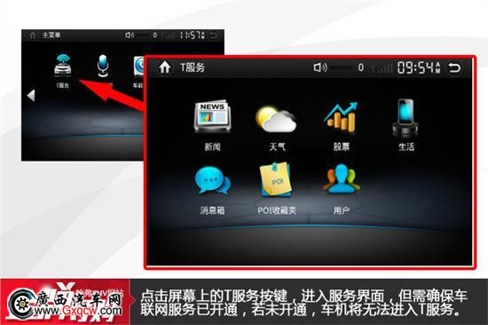 在T服務(wù)界面下,用戶可以車主在車載終端點(diǎn)擊“股票、新聞、天氣”按鍵可查詢?nèi)魏喂善毙畔、想要看的新聞、天氣情況,為保證安全,車載終端提供語(yǔ)音播報(bào)新聞。