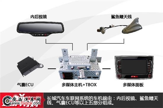 車機(jī)端,也就是車載終端,他的組件包括內(nèi)后視鏡、鯊魚鰭天線、氣囊ECU、多媒體主機(jī)+TBOX和多媒體面板五部分組成。