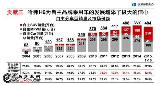 貢獻三,哈弗H6為自主品牌乘用車的發(fā)展增添了極大的信心。自主品牌乘用車的發(fā)展困難重重,屢遭挫折。但哈弗H6在整個自主品牌最困難的時期,依然保持了較高增長,而且是長期的,幾十個月的高增長,極大鼓舞了自主品牌發(fā)展的信心。
