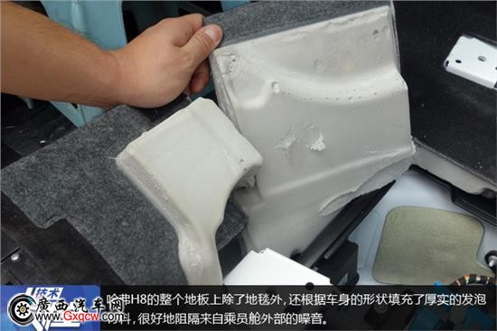 由于車身底部會有一些加強(qiáng)筋等特殊結(jié)構(gòu),所以車身地板同樣是不平整的。哈弗H8在整個(gè)車身地板上根據(jù)凹凸形狀填充了厚厚的發(fā)泡吸音材料,形成一個(gè)平整的平面,然后再在上面鋪設(shè)傳統(tǒng)的地毯,這就大大阻隔了來自車身底部的噪音。