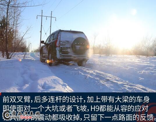 在下午的時(shí)候,林中穿越這種輕度的越野,對(duì)于H9來(lái)說(shuō)可謂是小菜一碟了,即使用AUTO模式都有點(diǎn)大材小用,在雪地里行車其實(shí)重要的還是對(duì)于路況的預(yù)判和觀察,遇到一些暗冰或者大坑可能會(huì)對(duì)車輛造成危險(xiǎn)。駕駛H9通過(guò)雪地的樂(lè)趣,是感受非承載車身對(duì)于震動(dòng)和顛簸的吸收能力,也就是底盤的濾震緩沖能力。H9在這一方面非常出色,前雙叉臂,后多連桿的設(shè)計(jì),加上帶有大梁的車身。給人以駕馭的安全感,即使面對(duì)一個(gè)大坑或者小坡的飛躍,H9都能從容的應(yīng)對(duì),將大部分的震動(dòng)都吸收掉,只留下一點(diǎn)路面的反饋,車廂內(nèi)的乘客也不會(huì)感受到劇烈的顛簸,和車身變形帶來(lái)的異響。這一點(diǎn)非承載車身確實(shí)有得天獨(dú)厚的優(yōu)勢(shì)。