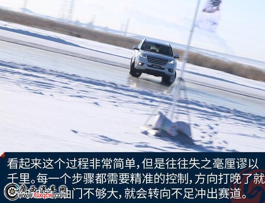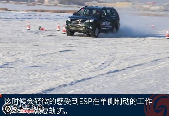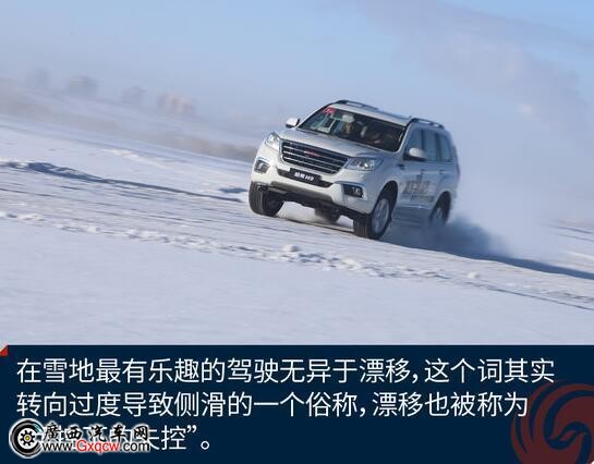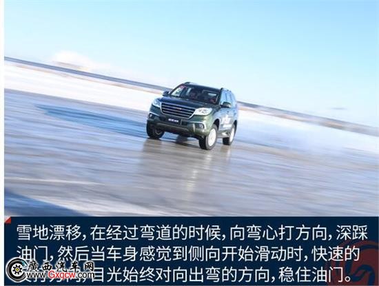 在雪地最有樂(lè)趣的駕駛無(wú)異于漂移,這個(gè)詞其實(shí)轉(zhuǎn)向過(guò)度導(dǎo)致側(cè)滑的一個(gè)俗稱,漂移也被稱為“可控下的失控”,掌握好車輛在失控和可控的邊緣非常重要。這也是漂移的關(guān)鍵,在一段完全封閉的場(chǎng)地里,由教練規(guī)劃出了一條賽道,賽道由大大小小的彎道組成,就是考驗(yàn)大家在彎道里如何快速通過(guò),當(dāng)然漂移也是樂(lè)趣之一,H9在關(guān)閉了ESP電子穩(wěn)定系統(tǒng)后,切入AUTO模式,檔位選擇手動(dòng)模式。因?yàn)镠9位適時(shí)四驅(qū)的系統(tǒng),動(dòng)力會(huì)自動(dòng)分配到前橋和后橋,平時(shí)是以后驅(qū)為主。在經(jīng)過(guò)彎道的時(shí)候,向彎心打方向,深踩油門,然后當(dāng)車身感覺(jué)到側(cè)向開(kāi)始滑動(dòng)時(shí),快速的反打方向,目光始終對(duì)向出彎的方向,穩(wěn)住油門。就可以完成一個(gè)漂亮的漂移,看起來(lái)這個(gè)過(guò)程非常簡(jiǎn)單,但是往往失之毫厘謬以千里。每一個(gè)步驟都需要精準(zhǔn)的控制,方向打完了就轉(zhuǎn)向過(guò)度掉過(guò)頭來(lái),油門不夠大,后輪突破不了抓地極限,就會(huì)以一個(gè)很快的速度推頭沖出賽道,而反復(fù)經(jīng)歷這個(gè)過(guò)程也是漂移學(xué)習(xí)的樂(lè)趣之一。