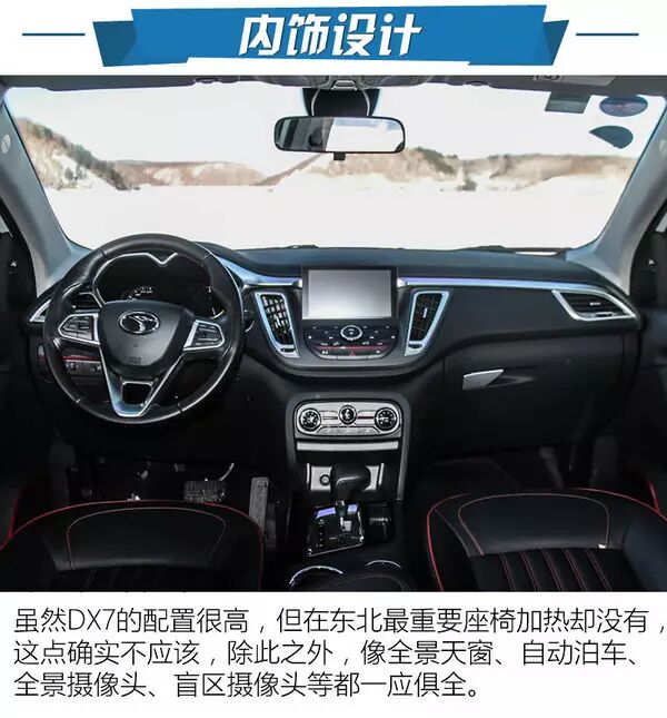 此次試駕的是頂配的1.5T自動尊貴型,前驅(qū)的設定是大家最長遇到驅(qū)動形式。在冬季比較漫長的東北,街上大部分車都換裝了這種冬季胎,來保證低溫也有不錯的抓地力,試駕車也不例外。DX7的配置很高,像全景天窗、自動泊車、全景攝像頭、盲區(qū)攝像頭等都一應俱全。