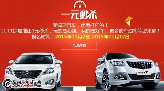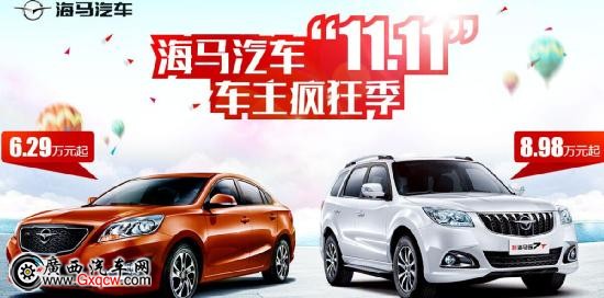 隨著“雙11”的不斷臨近,海馬汽車近日正式啟動(dòng)了“雙11車主瘋狂季”促銷活動(dòng);顒(dòng)期間送油卡、送現(xiàn)金、1元購車等精彩環(huán)節(jié)將為您送上****的超級(jí)優(yōu)惠。這一切,只為您能盡快享受到幸福家轎——福美來,帶給您的高品質(zhì)生活享受。