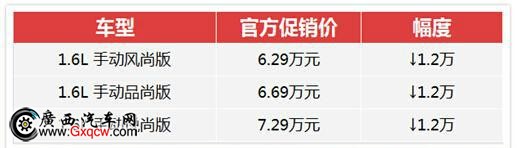 這次促銷優(yōu)惠主要針對3款手動擋車型,這也是性價比*高的3款車型。其中原價7.49萬元的1.6升手動風(fēng)尚型的促銷價格僅為6.29萬元,原價7.89萬元的1.6升手動品尚型的促銷價格僅為6.69萬元,原價8.49萬元的1.6升手動悅尚型的促銷價格僅為7.29萬元。