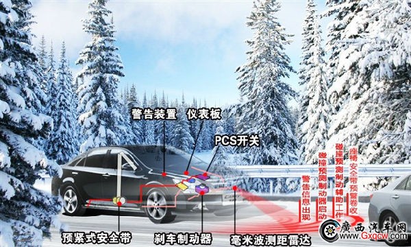 預(yù)碰撞安全系統(tǒng)主要由4個(gè)系統(tǒng)組成:預(yù)碰撞座椅安全帶、預(yù)碰撞制動(dòng)、預(yù)碰撞輔助制動(dòng)和懸架控制。制動(dòng)系統(tǒng)已經(jīng)可以實(shí)現(xiàn)即使駕駛員還沒踩剎車踏板,剎車系統(tǒng)便可以施加一部分制動(dòng)力。而懸架控制系統(tǒng)可以抑制車輛在全力剎車時(shí)的點(diǎn)頭現(xiàn)象。