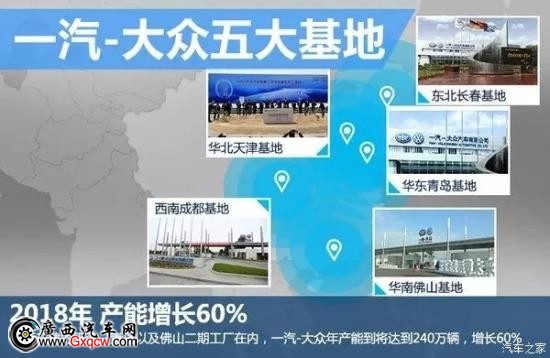 預(yù)計(jì)到2018年,一汽-大眾將擁有五大產(chǎn)業(yè)基地,實(shí)現(xiàn)年產(chǎn)量增長60%的戰(zhàn)略目標(biāo)。其中東北長春基地貢獻(xiàn)66萬輛,西南成都基地貢獻(xiàn)54萬輛,華南佛山基地貢獻(xiàn)30萬輛,2017年建成的佛山二期項(xiàng)目將再貢獻(xiàn)30萬輛,同樣計(jì)劃2017年完工的華東青島基地和計(jì)劃2018年完工的華北天津基地也將各自貢獻(xiàn)30萬輛。截止至2018年一汽-大眾五大基地將全部建成并投產(chǎn),屆時(shí)年產(chǎn)能將達(dá)到240萬輛,較目前水平增長60%。