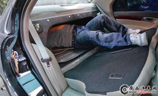 2、接下來鉆進后備箱,如果是身材比較高大的車主,可以在后窗玻璃下方附近找到雙排椅背解鎖鍵,并用雙腳將后排座椅完全放倒。