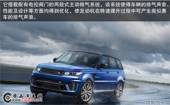 作為高性能車型,駕駛氛圍同樣重要,攬勝運(yùn)動版SVR擁有更具視覺沖擊力的外觀,而定制化的跑車座椅也令其獨(dú)樹一幟。它搭載配有電控閥門的兩段式主動排氣系統(tǒng),該系統(tǒng)使得車 輛的排氣聲音、性能及設(shè)計(jì)等方面均得到優(yōu)化,使發(fā)動機(jī)在轉(zhuǎn)速提升過程中可產(chǎn)生類似賽車的排氣聲浪。