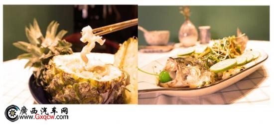 讓 人驚艷的無(wú)骨鳳爪菠蘿,剛上菜的時(shí)候,還以為只是傳統(tǒng)的菠蘿飯,把菠蘿蓋打開(kāi),里邊是菠蘿碎和蒜蓉腌制成的鳳爪,比起普通的白云鳳爪,更多了一層水果口 感,更清爽更香甜,而利用蒜蓉本身的辣味,比起使用辣椒的辣味沒(méi)有那么強(qiáng)勁更適應(yīng)各類(lèi)人群。將百香果調(diào)汁淋在鱸魚(yú)身上蒸的百香果鱸魚(yú),配著水果的菜清爽又 可口。還有有蝦醬炒通菜,讓空心菜變得海味十足。