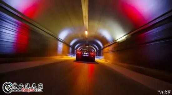 當超級跑車呼嘯而過時,隧道內部安裝的照明系統(tǒng),也由白色變成了捷豹標志性的紅色,向這臺至美猛獸行注目禮。