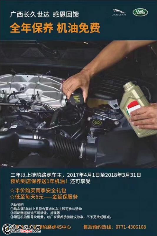 為回饋廣大捷豹路虎忠實客戶,廣西長久世達為三年以上捷豹路虎車主送保養(yǎng)福利,預(yù)約熱線:0771-4306168 地址:南寧南站大道9號捷豹路虎4S中心。